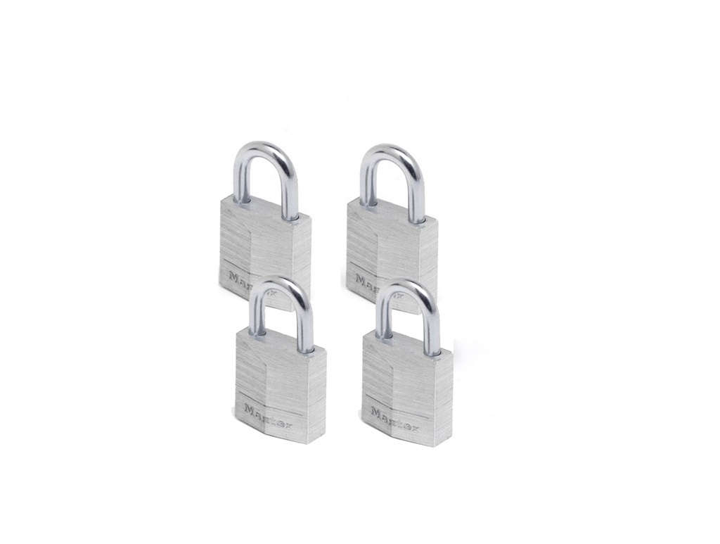 Set of 4 20mm aluminum padlocks with same key, MASTERLOCK. Solid body made of hard aluminum and neck made of steel with double locking. It does not rust. Toothed cylinder.