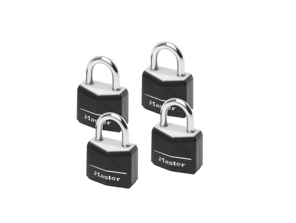 Set of 4 padlocks with protection cover and matching keys, MASTERLOCK • Solid aluminum body with vinyl cover that protects against scratches and corrosion
