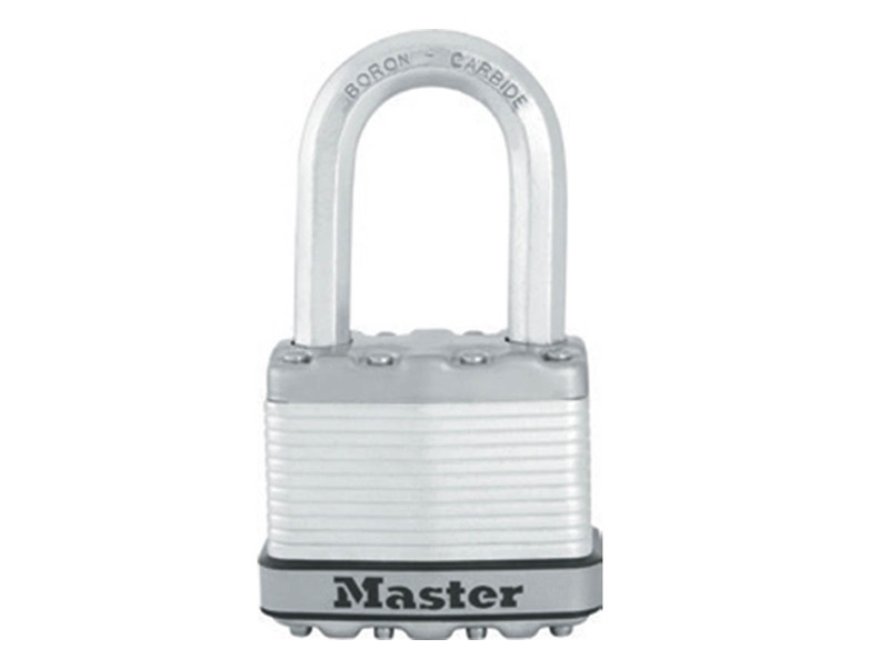 High security EXCELL padlock, MASTERLOCK. • Processed laminated steel body for weather resistance.