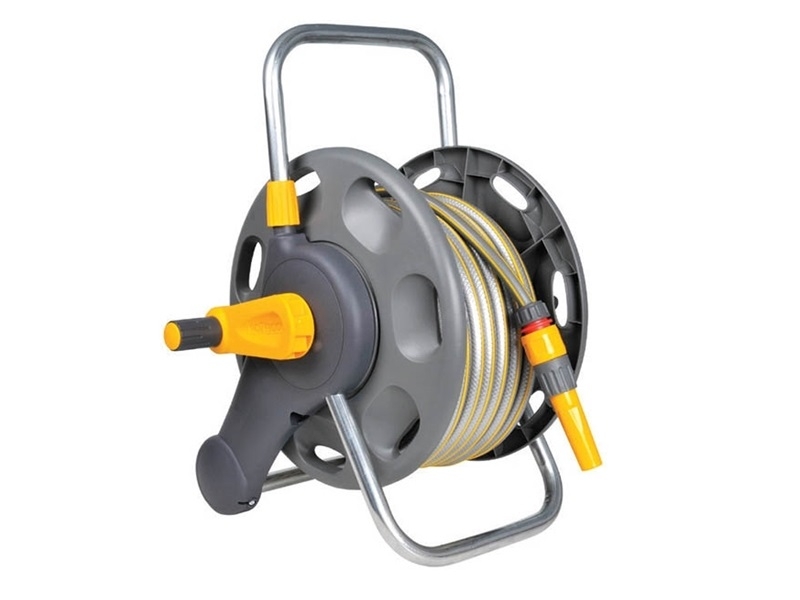 Includes rubber 25m 1/2 ". It stands free or is mounted on a wall. Includes wall mount, screws, watering nozzle, two quick couplers, one aqua stop quick coupler and faucet fitting.