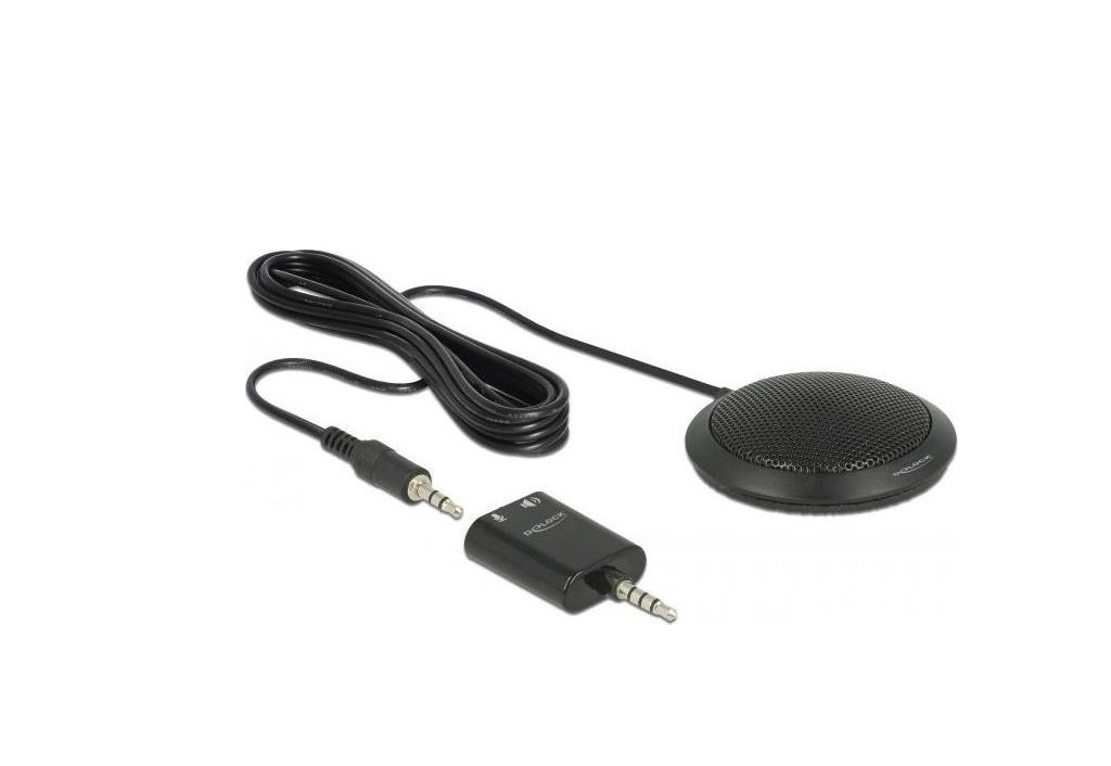 Επιτραπέζιο πυκνωτικό μικρόφωνο της Delock. Η υπερκατευθυντική και κωνική κατεύθυνσή του βεβαιώνει πως ο ήχος δεσμεύεται άριστα και γι’ αυτό διαθέτει μεγάλο εύρος και είναι κατάλληλο για καταγραφή συνεντεύξεων, συνεδρίων, διαλέξεων κτλ. Μπορεί να συνδεθεί σε οποιοδήποτε PC ή laptop μέσω της θύρας στερεοφωνικής υποδοχής των 3.5mm 3pin. Ο αντάπτορας Υ των 3.5mm 4pin που συμπεριλαμβάνεται επιτρέπει επίσης τη σύνδεση σε tablet ή smartphone.
