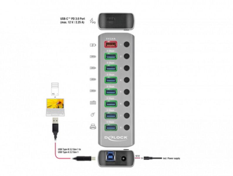 Το Hub USB 3.0 Gen 1 της Delock μπορεί να συνδεθεί με υπολογιστή μέσω καλωδίου USB επεκτείνοντας τον με 7 θύρες USB ενώ διαθέτει και 1 ακόμα θύρα USB ταχείας φόρτισης συσκευών όπως smartphone με απόδοση 2,4A και 1 θύρα USB Type-C PD 3.0 με απόδοση 12V και 2,25A, οπού μπορούν να φορτίσουν ακόμη και τα laptop. Οι συνδεδεμένες συσκευές όπως τα smartphone μπορούν να φορτιστούν ή να μεταφέρουν δεδομένα στα 5 Gbps. Κάθε θύρα μπορεί να ενεργοποιηθεί ή να απενεργοποιηθεί ξεχωριστά χρησιμοποιώντας τους διακόπτες. Είναι ένα κομψό προϊόν υψηλής ποιότητας το οποίο είναι κατασκευασμένο από αλουμίνιο. Το design και η αίσθηση του μεταλλικού υλικού της κατασκευής δίνει ιδιαίτερο τόνο στο γραφείο σας, ταιριάζοντας αρμονικά με τις υπόλοιπες συσκευές σας.
