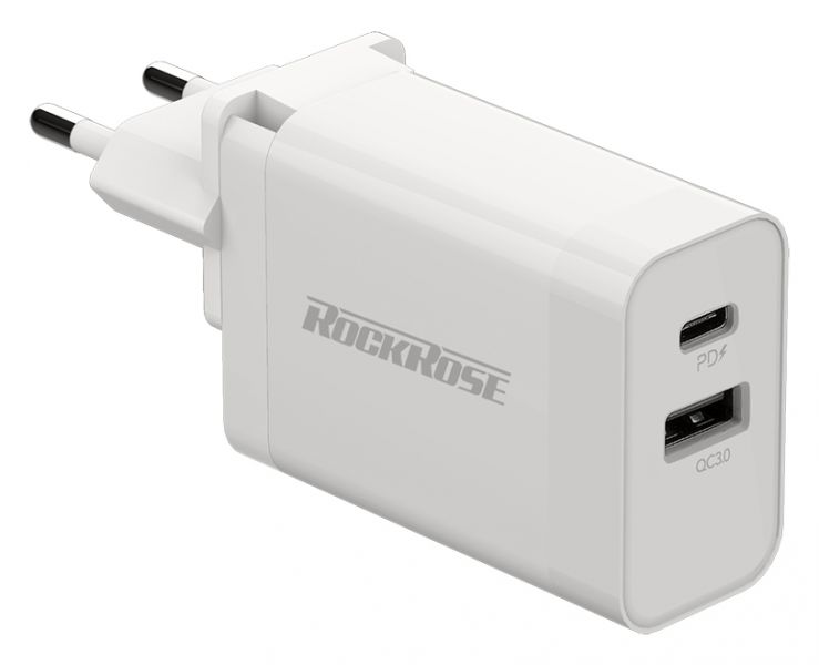 Υψηλής απόδοσης USB φορτιστής τοίχου της ROCKROSE, κατασκευασμένος από ανθεκτικό υλικό και συμβατός με όλες τις συσκευές που φορτίζουν μέσω USB θύρας. Έχει κομψό design και υποστηρίζει fast charging λειτουργία. Διαθέτει 2 USB θύρες εξόδου, μια USB QC 3.0 και μια USB Type-C PD, με μέγιστη απόδοση 30W. Είναι ελαφρύς, κομψός και διαθέτει κυκλώματα προστασίας από υπερβολική τάση, υπερφόρτιση, υπερθέρμανση, βραχυκύκλωμα.
