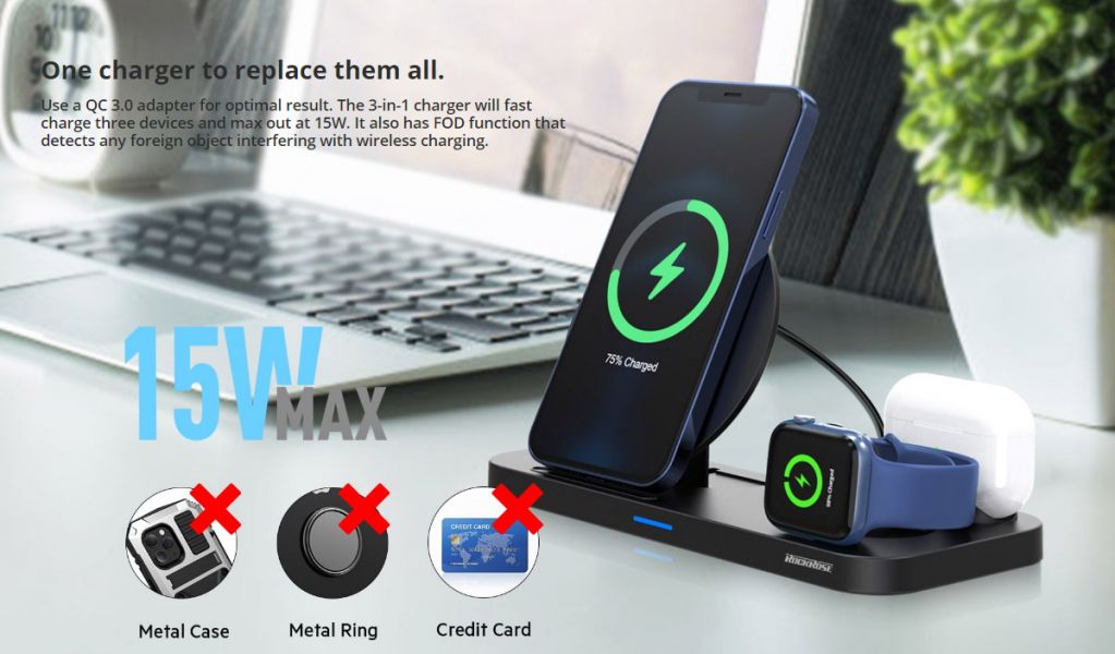 ROCKROSE ασύρματος φορτιστής Airwave Max 3in1, 15W, μαύρος