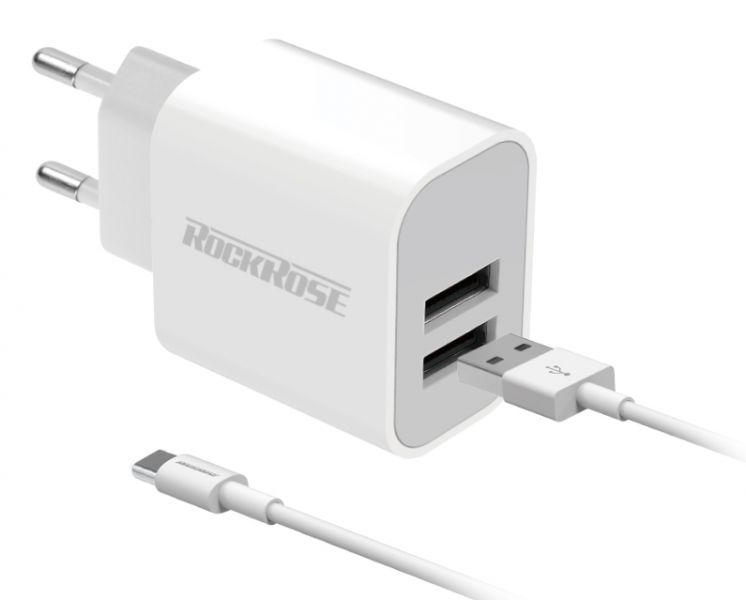 ROCKROSE φορτιστής τοίχου RRTCC02CEU, καλώδιο USB-C, 2x USB 12W, λευκός