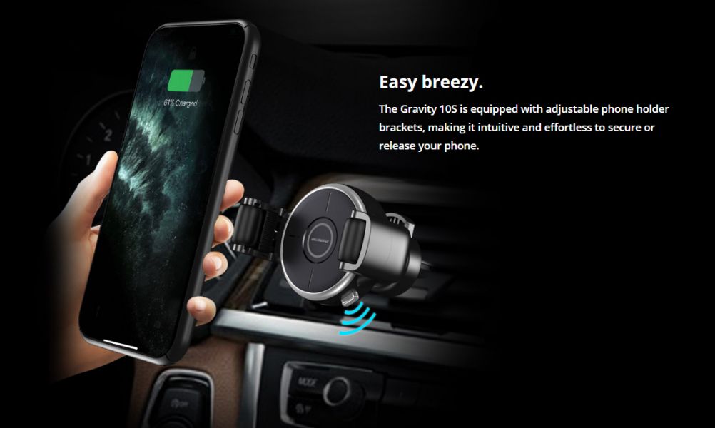 Ασύρματος φορτιστής αυτοκινήτου 10W και βάση smartphone με στήριξη στους αεραγωγούς του αυτοκινήτου. Διαθέτει ρυθμιζόμενο βραχίονα και σύστημα εύκολης ασφάλισης/απασφάλισης, για απρόσκοπτη χρήση και σταθερότητα. Ρυθμίζεται προς κάθε κατεύθυνση (κατά 360°) ώστε να πετύχετε την ιδανική γωνία λήψης. Είναι συμβατή σχεδόν με κάθε τύπο αεραγωγού αυτοκινήτου και διακρίνεται για την σταθερότητα με την οποία κουμπώνει στους αεραγωγούς, αποτρέποντας επιπρόσθετες μετακινήσεις.Για την λειτουργία του απαιτείται η παροχή ρεύματος από φορτιστή.