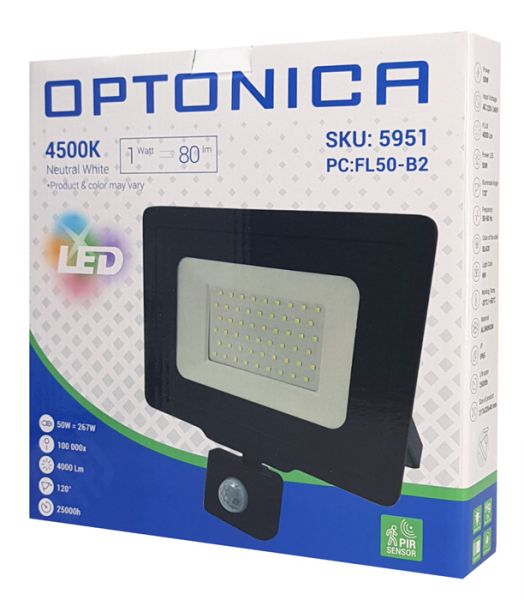 LED προβολέας της Optonica, με ισχύ 50W και αισθητήρα κίνησης PIR με οπτικό πεδίο ανίχνευσης 120°. Διαθέτει μεταλλικό περίβλημα με στεγανοποίηση επιπέδου IP65 και είναι ιδανικός για χρήση σε εξωτερικούς χώρους.