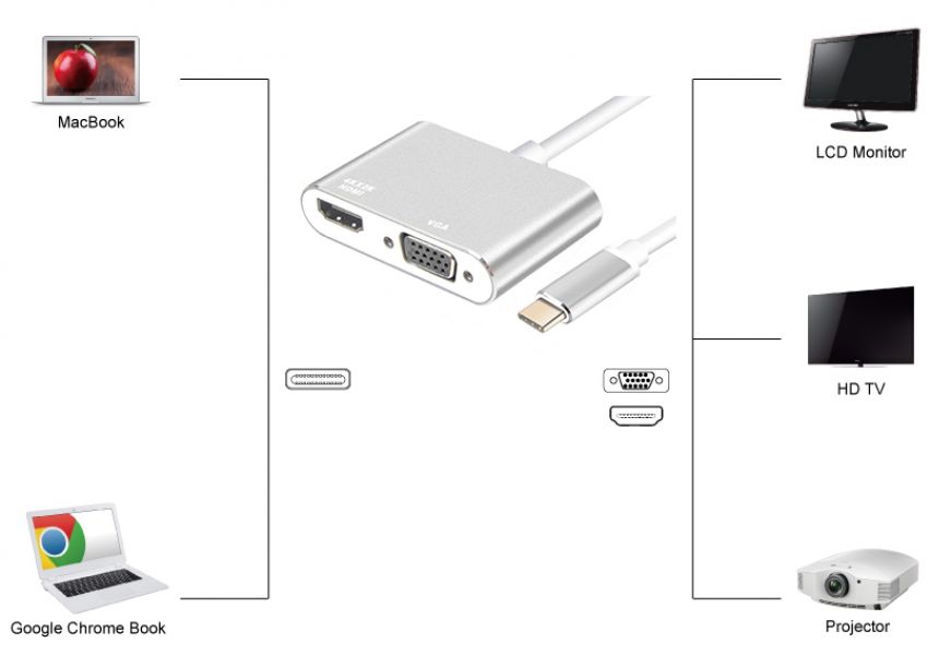 Converter για σύνδεση συσκευών με USB Type-C έξοδο σε οθόνες και προτζέκτορες με VGA ή HDMI είσοδο.