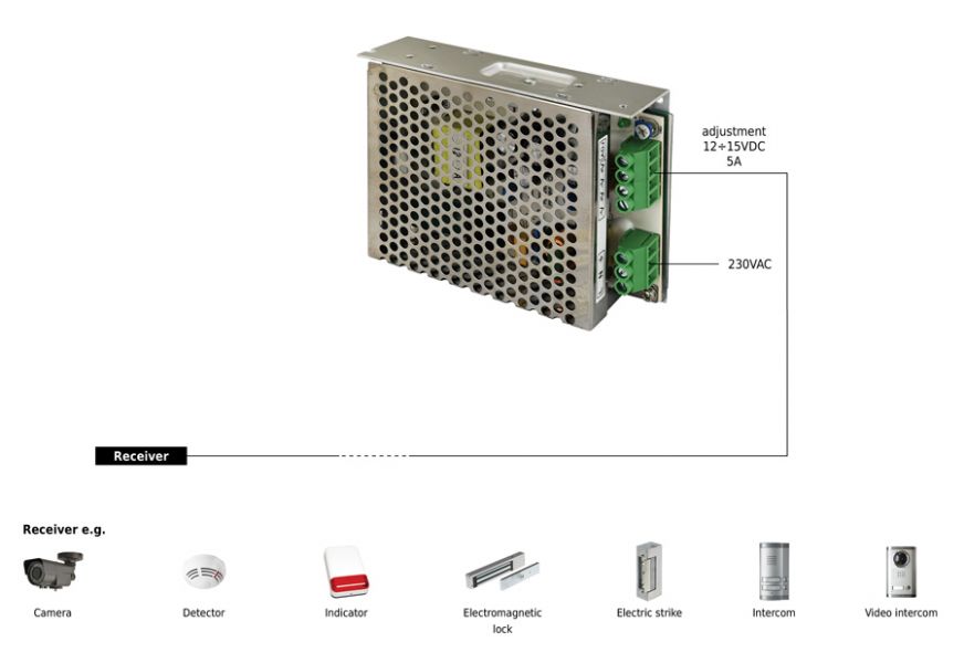 Έξοδος τροφοδοσίας: 5A/12V DC, pυθμιζόμενη τάση εξόδου: 12-15V DC