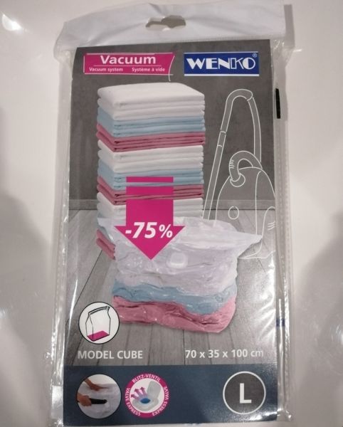 Θήκη vacuum cube L, WENKO. Θήκη φύλαξης με βάση για μεγαλύτερο όγκο. Χρησιμοποιήστε την ηλεκτρική σκούπα για να δημιουργήσετε κενό αέρος, έτσι εξοικονομείται μέχρι 75% περισσότερο χώρο. Μετά τη χρήση τα ρούχα σας επανέρχονται στον αρχικό τους όγκο.
