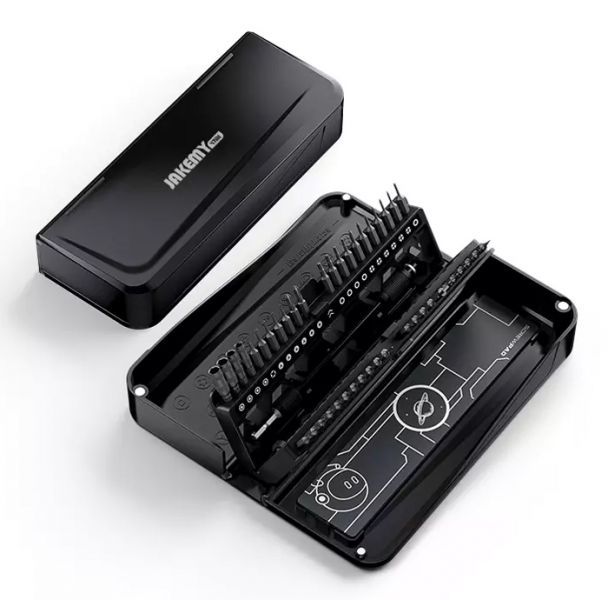 Σετ κατσαβιδιών της Jakemy το οποίο αποτελείται από κατσαβίδι, προέκταση, μαγνητικό φύλλο και 30 διαφορετικές μύτες κατσαβιδιού.