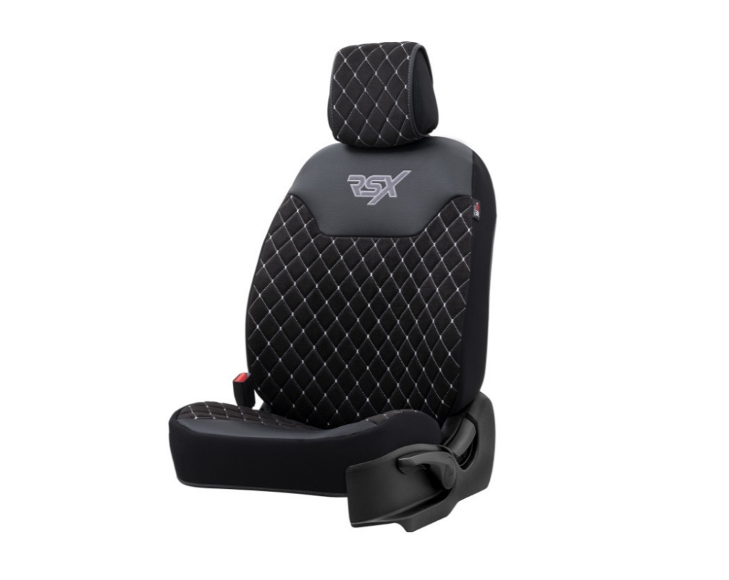 Otom RSX Diamond car seat cover for front seats. It offers full coverage, and protection from dirt and wear while maintaining the original upholstery. It is made of leatherette or otherwise synthetic leather, a material that is extremely smooth and does not require constant care like natural leather. Leatherette offers a softer feel when driving, while also adding a luxurious look to the car's cabin.