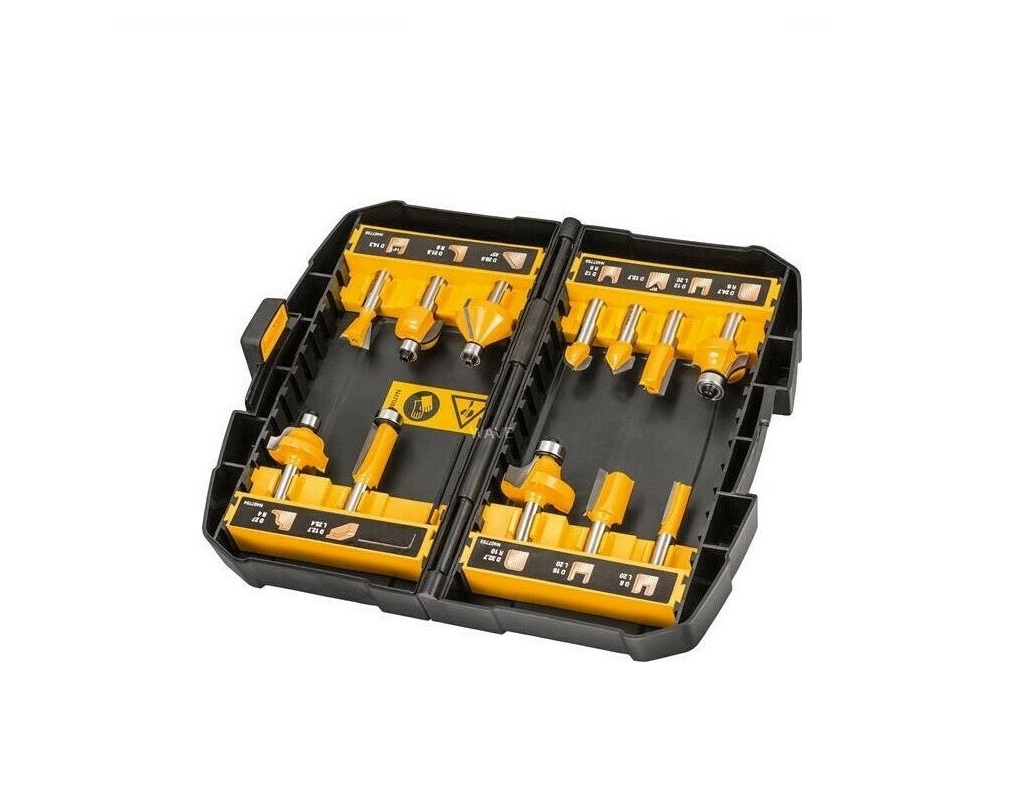 Το Dewalt DT90016 σετ κοπτικών ρούτερ είναι κατάλληλο για ξύλο. Έχουν ειδικά διαμορφωμένο σώμα που εξασφαλίζει λειτουργία χωρίς κλότσημα σε ξύλο. Οι λεπίδες τους είναι κατασκευασμένες από υψηλή ποιότητα καρβίδιο για πιο ακριβείς λοξοτομές, κατάλληλες για τις πιο δύσκολες εφαρμογές, και για μέγιστη διάρκεια ζωής. Τα ρουλεμάν μπορούν να αντικατασταθούν για ακόμη μεγαλύτερη διάρκεια ζωής των μεμονωμένων κοπτικών. Οι διάμετρος του άξονα είναι 8mm.