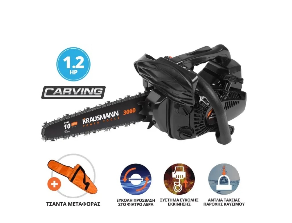 Εύχρηστο και μικρό σε μέγεθος αλυσοπρίονο βενζίνης 25cc, με σύστημα εύκολης εκκίνησης, αντλία παροχής καυσίμου και εύκολη πρόσβαση στο φίλτρο. Διαθέτει λάμα τύπου carving και είναι κατάλληλο για ελαφριές εργασίες κοπής, π.χ. κλαδιά, καυσόξυλα, αλλά και για εργασίες λάξευσης.