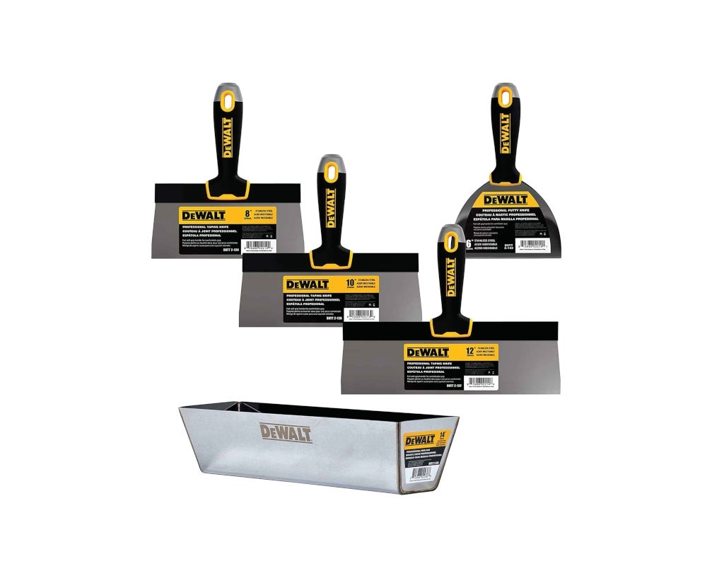 Το DeWalt 3‑174 SS επαγγελματικό σετ σπάτουλες περιλαμβάνειτέσσερις ανοξείδωτες σπάτουλες και ένα πρακτικό σκαφάκι για εύκολη ανάμειξη και μεταφορά υλικών. Οι σπάτουλες διαθέτουν εργονομικές λαβές soft grip, προσφέροντας άνεση και ακρίβεια κατά τη χρήση. Οι λεπίδες είναι κατασκευασμένες από ανθεκτικό ανοξείδωτο ατσάλι, που εξασφαλίζει μακροχρόνια αντοχή και αντιδιαβρωτική προστασία.