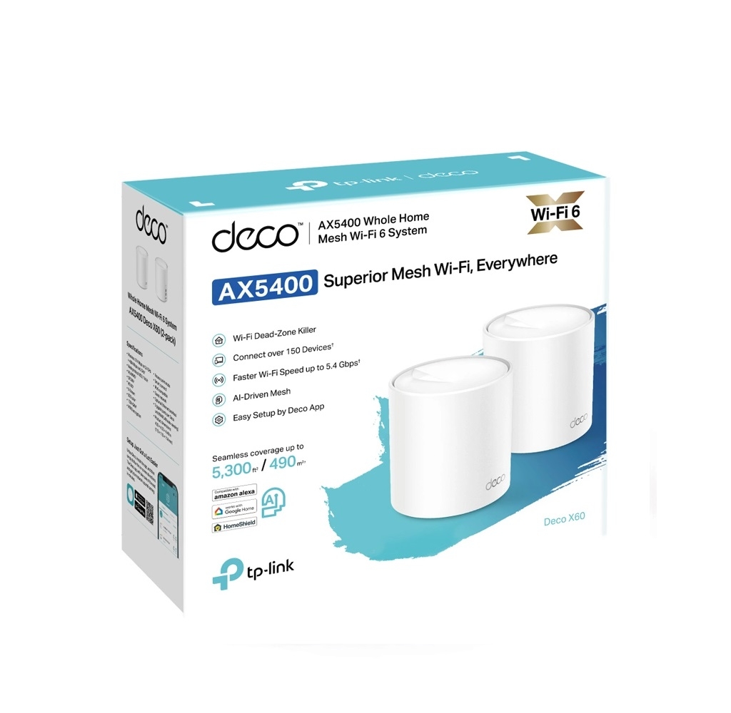 Το Deco X60 αποτελεί έναν απλό τρόπο για να αποκτήσετε ισχυρό σήμα Wi-Fi σε κάθε γωνιά του σπιτιού σας. Παρέχει γρήγορες και σταθερές συνδέσεις με ταχύτητες έως 574 Mbps στα 2.4 GHz και 4804 Mbps στα 5 GHz, αντικαθιστώντας τις νεκρές ζώνες με ισχυρό, γρήγορο Wi-Fi σε κάθε δωμάτιο.
