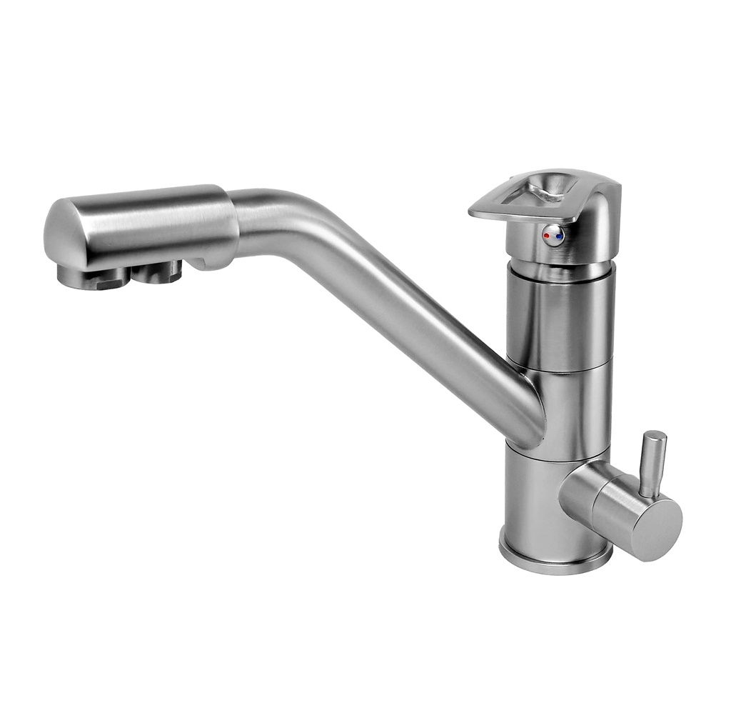 Αυτή η μπαταρία πάγκου κουζίνας διαθέτει τρίοδο σχεδιασμό για τη σύνδεση με φίλτρο νερού και το δίκτυο παροχής ζεστού και κρύου νερού. Έτσι, μπορείτε να απολαμβάνετε καθαρό, φιλτραρισμένο νερό και να επιλέξετε παράλληλα ανάμεσα σε ζεστό και κρύο νερό με τους διακόπτες.