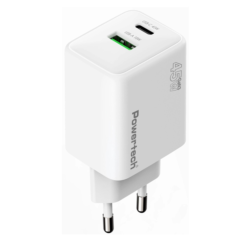 Υψηλής απόδοσης φορτιστής τοίχου της Powertech, κατασκευασμένος από ανθεκτικό υλικό και συμβατός με συσκευές που φορτίζουν μέσω θύρας USB. Διαθέτει USB και USB-C θύρες εξόδου που υποστηρίζουν φόρτιση με μέγιστη απόδοση 45W.
