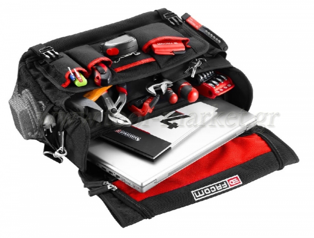• Inside: 14 pockets, two straps pliers, wrenches and screwdrivers, 1 meter hook-roll. One pocket with foam for the PC (maximum 15 "), tablet-or A4 documents.